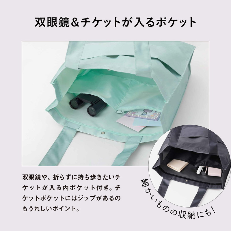 双眼鏡や、折らずに持ち歩きたいチケットが入る内ポケットつき。チケットポケットにはジップがあるのもうれしいポイント。