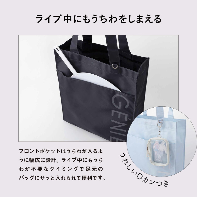 フロントポケットはうちわが入るように幅広に設計。ライブ中にもうちわが不要なタイミングでは足元のバッグにサッと入れられて便利です。