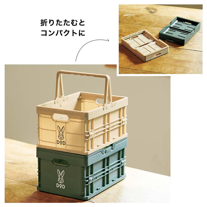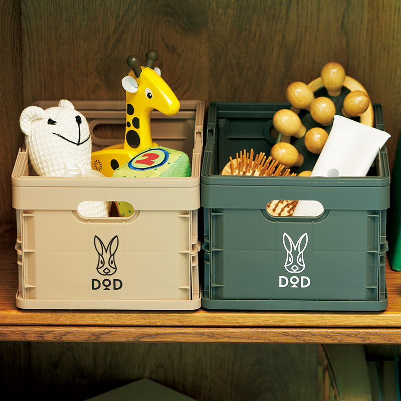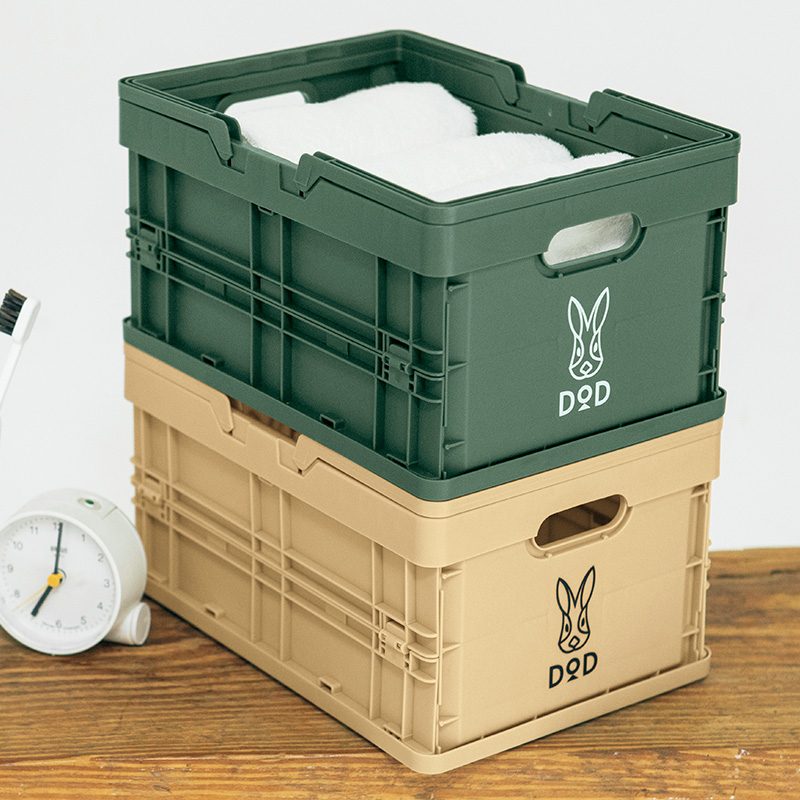 DODの持ち手付きのコンテナボックスです。折りたたんで持ち運べるので屋内だけでなく、キャンプやBBQなど野外のレジャーにも重宝します。スタッキングして使えるので複数購入もおすすめです。