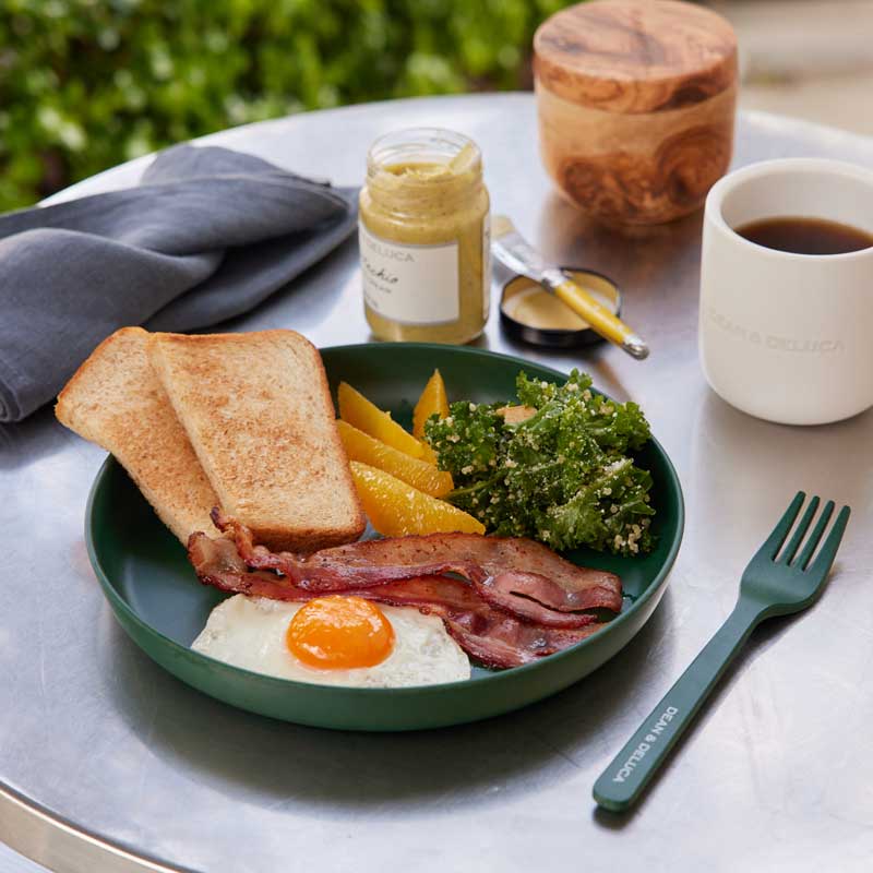 環境に配慮したバンブーファイバー入りの食器&カトラリー。軽くて手に負担がかからないので、食べる練習中のお子さんから年輩の方まで気軽に使えます。